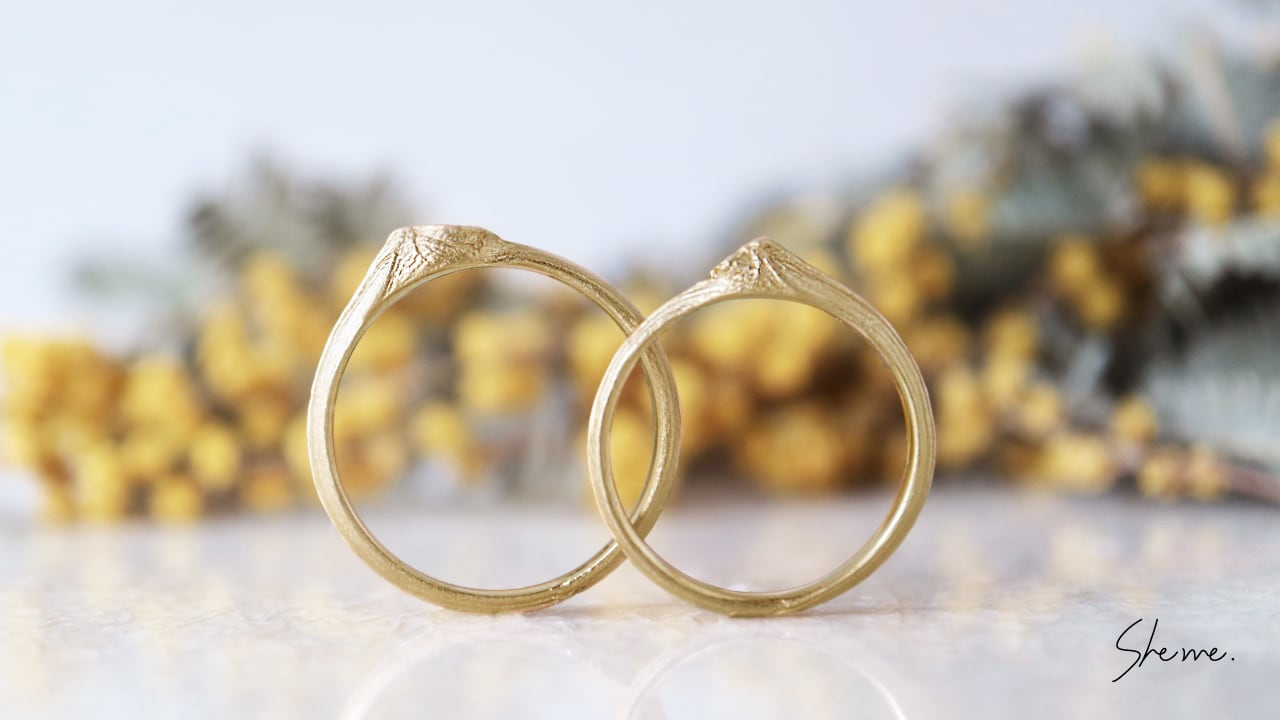 植物ならではのナチュラルなテクスチャは、身に着けるひとにやさしくそっと寄り添うマリッジリングになっております