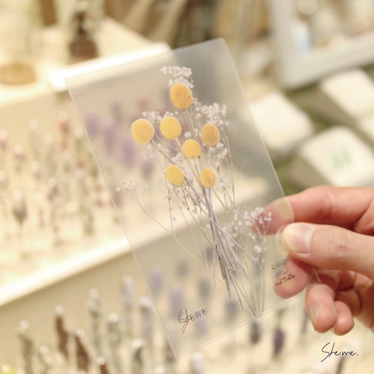 ドライフラワー部分のみ裏に白印刷を施すことにより押し花のような仕上がりに。