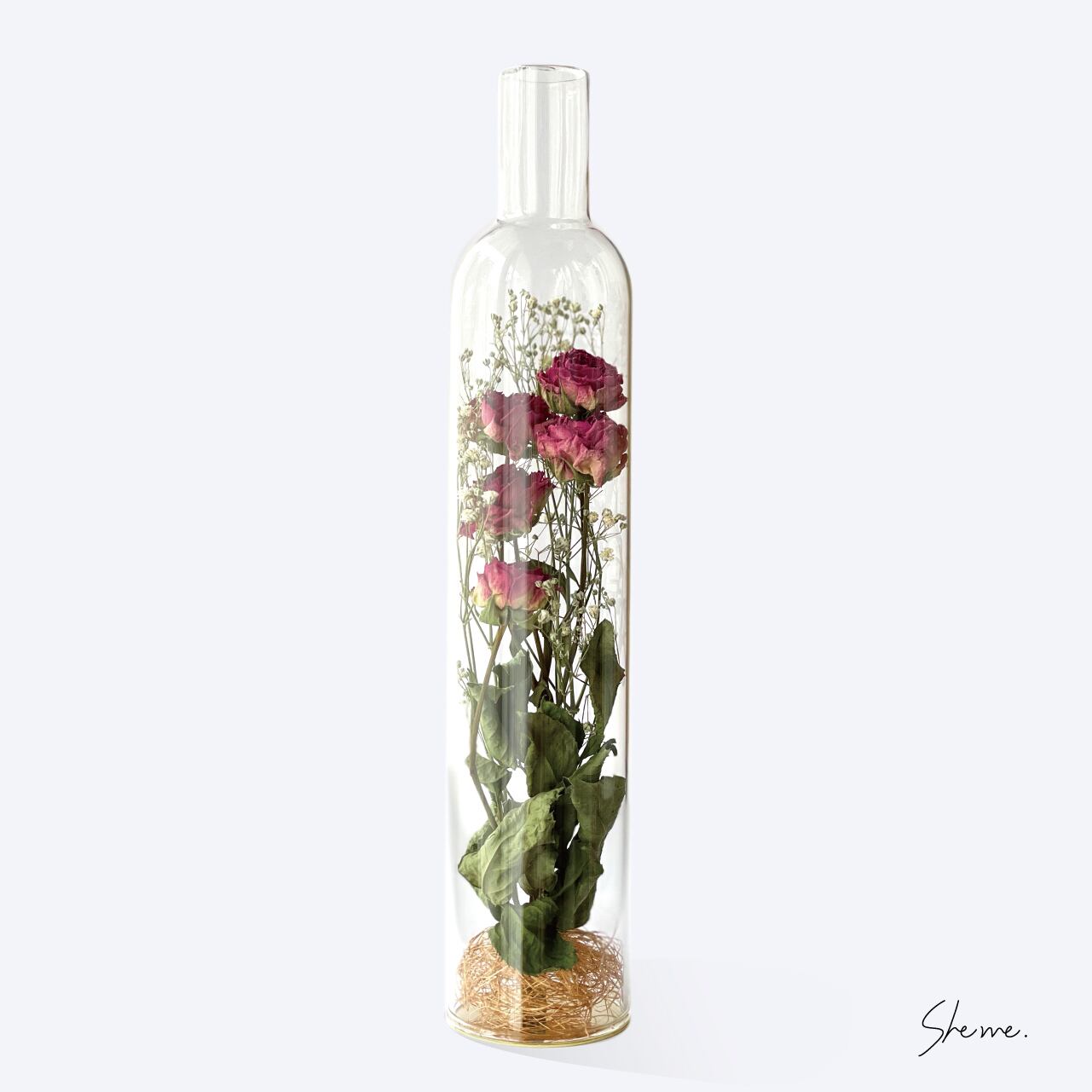 ガラスボトルにドライフラワーを詰めて蓋をして密閉しているので、通常よりも長持ちし埃や害虫などからも守れる為お手入れもしやすくなっています。